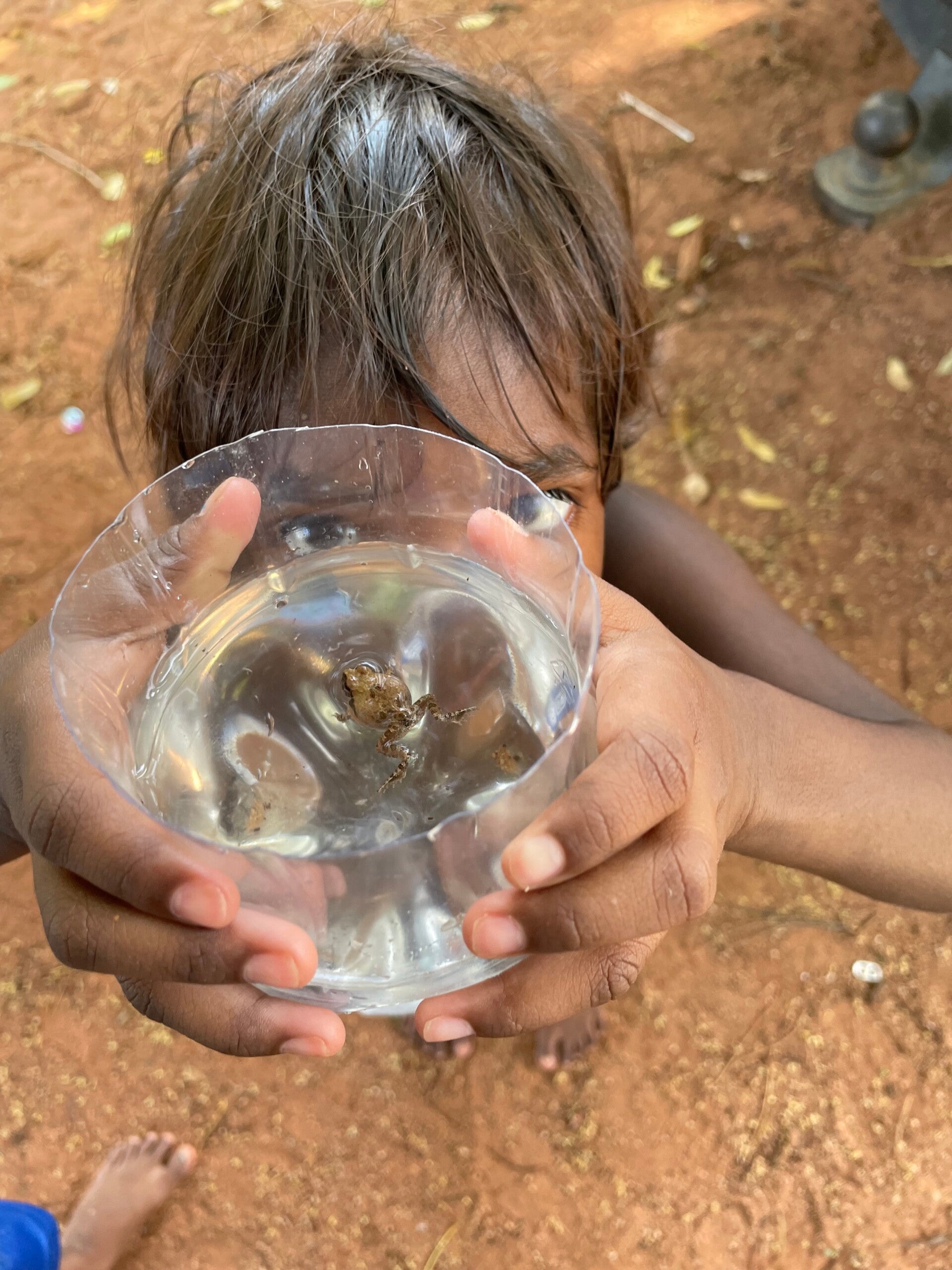 So I've seen green frogs (toilet photo - its a clean toilet, just old and stained!), a small brown frog (photo of which I rescued at one of the clinics), and a small baby cane toad (which the kids in the photo were playing with).